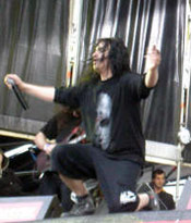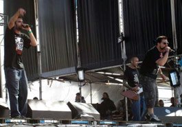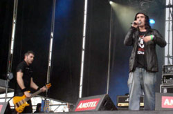 otros de los más esperados tras su reciente reunión. Sin Chato Chungo, sustituido por Distorsión Morales, pero con Vikingo MD, DJ Muerto y el resto de la tropa, los sevillanos dieron uno de los mejores conciertos del festival. Pocos quedaron indiferentes ante canciones como “A cada paso”, “Tu dios de madera”, “Puta policía” etc., pura energía y mala leche sobre el escenario, reivindicando su puesto en la escena metálica del país y lo necesarios que son para la misma. Hasta el cielo quedó impresionado con su show, pues justo al terminar el concierto cayó el chaparrón más grande de todo el festival, que hizo que el respetable corriera raudo hacia las (cada vez más) inundadas carpas. A pesar de que no soy muy aficionado al hip-hop, Violadores del Verso presentaron un más que correcto show que no decepcionó a sus incondicionales. Posteriormente llegó la hora de bailar con los franceses Gwendal, una de las apuestas más eclécticas de Extremúsika 2008, que hicieron botar y bailar al público asistente a su concierto. Los Mojinos Escocíos dieron lo que vienen siendo habitual en ellos, una actuación en la que la parte extramusical y la parafernalia humorística del Sevilla y compañía es tan importante como las propias canciones. Albertucho tiene cada vez más tirón y ello lo corrobora la gran cantidad de gente que se agolpó en las primeras filas para disfrutar del show del sevillano quién, acompañado de una más que solvente banda, presentó nuevos temas de su recién estrenado “Amasijo de porrazos” junto a otros más antiguos que fueron coreados a pleno