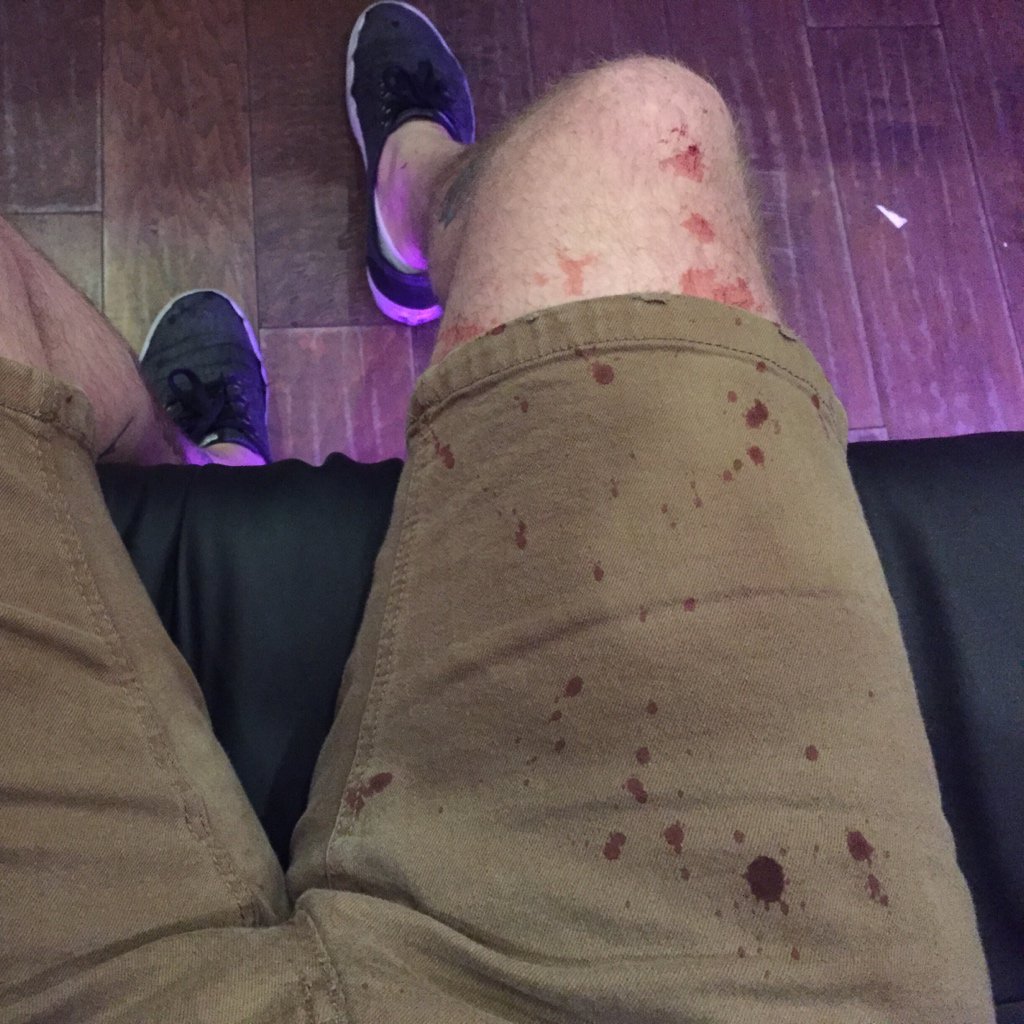 Lo dudo, creo que se refería a que alguien se ha peleado en ese concierto (y él habrá ido a separar o algo y le habrá salpicado).