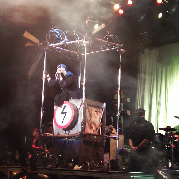Está recuperando y mutando los artilugios e ideas de giras pasadas, supongo que para que no haya mucho contraste entre su directo y el de Zombie justo después. Si ha cambiado el podium (que ahora se parece más a la estética de Zombie), se viste de obispo pero en vez de blanco en rojo, ahora aparece con los brazos largos que utilizaba en the dope show en la gira del grotesque, sólo que es blanco en vez de negro...