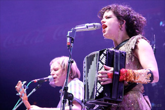 Un show, decía, que aunque se centrara en la presentación de su fenomenal último disco “The Suburbs”, también tuvo tiempo para recordar por qué Arcade Fire se han hecho tan populares con apenas tres discos en su haber. Así, del último trabajo del grupo no faltarían ya clásicos como la propia canción que da título al disco, que contó con el magnífico videoclip de Spike Jonze estrenado recientemente como fondo a su actuación, u otros como la más roquera “Month Of May” o la emotivo “Sprawl II (Mountains Beyond Mountains)”, donde su vocalista femenina Régine Chassagne cobró mayor protagonismo al igual que lo hizo durante el resto del concierto en el que la pudimos ver tocando instrumentos tan variados como los teclados, la batería o el acordeón, o incluso haciendo malabarismos con una especie de cariocas. Entre tanto, de sus dos anteriores disco no faltarían su primer hit “Laika”, la ya citada “No Cars Go” o “Rebellion (Lies)”, que daría por finalizada el concierto antes de la llegada de los convenientemente bien seleccionados bises materializados mediante “Intervention” y “Wake Up”, que todavía conseguirían que hasta el más cansado de los presentes dejara su última gota de energía, dejándose llevar por este magnífico “sueño” que Arcade Fire han construido a base de actuaciones tan memorables y únicas. Bienvenidos sean de nuevo.SETLIST