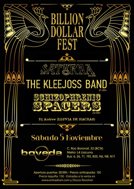 El próximo 5 de noviembre se celebrará la primera edición del Billion Dollar Fest en la sala Bóveda de Barcelona. Su objetivo es reunir algunas las mejores bandas de rock del país y por este año contará con las actuaciones de Schizophrenic Spacers (en la foto), The Kleejoss Band y Saturna, además de una sesión a cargo de DJ Andrew (Lluvia de Hachas). Las entradas anticipadas tienen un precio de 12 euros y pueden adquirirse en entradium.com. Ojalá que sea la primera de muchas.